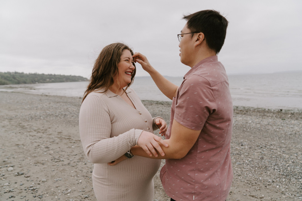 Discovery Park is one of my favorite locations for Seattle maternity shoots, especially on days like this. The lighthouse, open shoreline, and moody skies create a backdrop that feels timeless without trying too hard. Foggy days get a bad reputation, but they often produce the softest light and the most relaxed sessions.