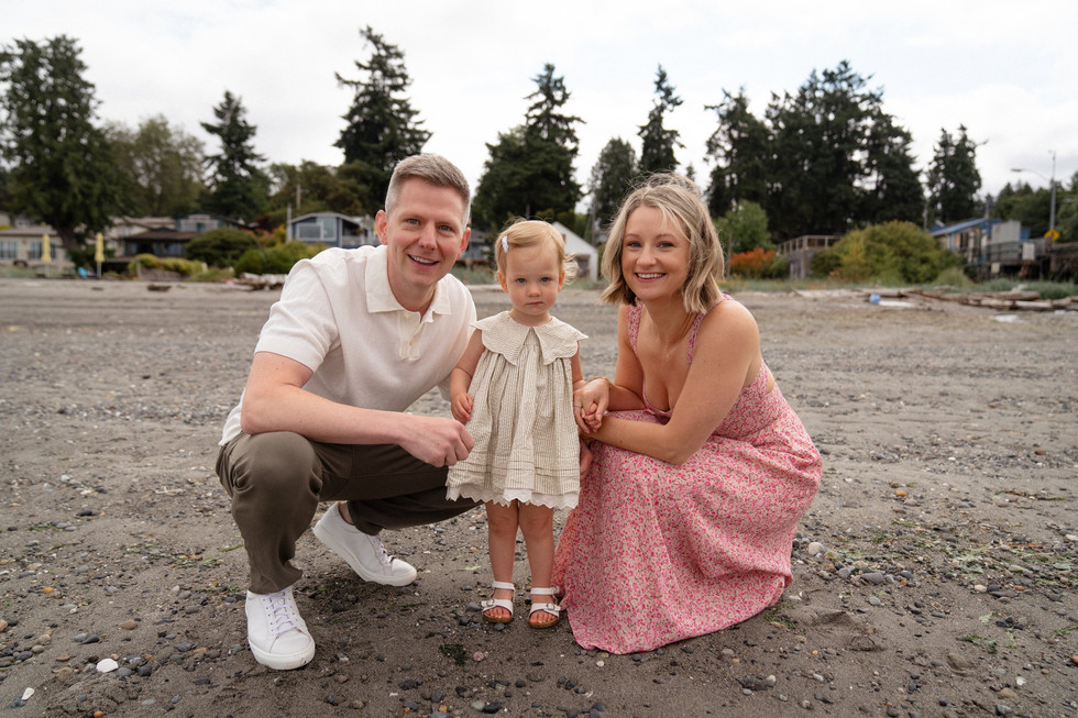 This summer I met up with Caitlyn, Alex, and their daughter Sloane for a family photo session at a quiet little beach near the Fauntleroy ferry dock in West Seattle. Even though it was a cloudy summer day, the soft light made for a calm and natural setting—perfect for relaxed family portraits by the water.